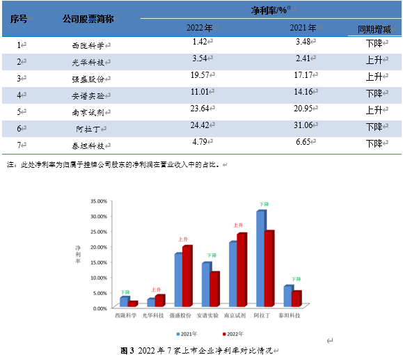 盈利情况:从净利润指标看,2022年7家上市企业的净利润增长率均值为7.67%,低于2021年均值(44.38%)约37个百分点,低于2020年均值(56.53%)近50个百分点。该报告期内,归属于挂牌股东的净利润均值较上年同期各公司出现了大幅度变化。除西陇科学、安谱实验和泰坦科技外,其他4家企业净利润均实现不同程度的增长。