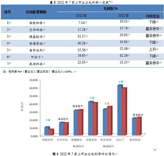 盈利能力分析:从利率指标来看,由于企业的产品结构变化和经营方式的影响,导致利率有所变化。2022年7家上市企业的净利率指标除阿拉丁变化幅度较大外,其他6家企业上升或者下降幅度在3.2%之内。而在毛利率指标中,除南京试剂有明显的上升外,泰坦科技、光华科技、强盛股份与上年同期基本持平,西陇科学、安谱实验和阿拉丁有一定程度的下降。各上市公司净利率及毛利率情况一览及对比情况见表4和图3、表5和图4。