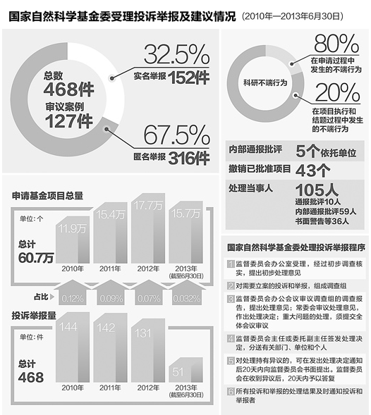 2013年08月01日,国家自然科学基金委员会网站,捍卫科学道德 反对科研不端——国家自然科学基金委员会召开科学道德建设通报会。2013年8月1日上午,国家自然科学基金委员会(以下简称基金委)在京召开科学道德建设通报会,通报了基金委在科学道德建设的举措以及2010年以来基金委监督委员会受理科研不端行为投诉举报以及处理情况。会上还特别公布了一批典型案例。