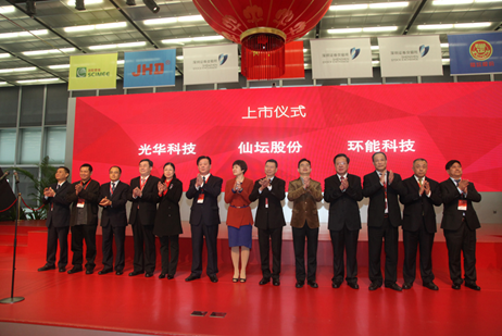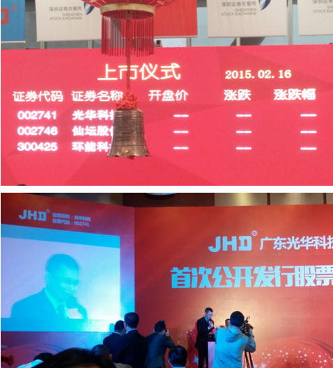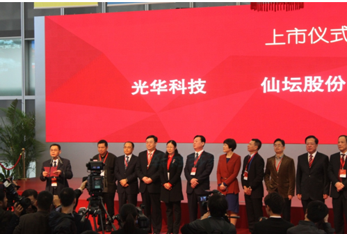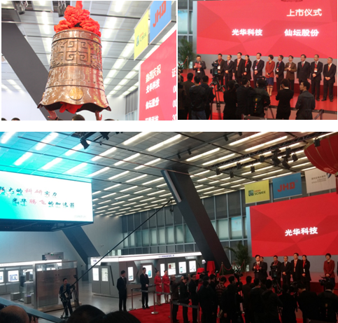 广东光华科技股份有限公司上市仪式于2015年2月16日上午9:00在深圳证券交易所举行。9时25分,随着光华科技上市的宝钟敲响,正式宣告公司在深交所中小板挂牌上市,股票代码为002741。光华科技首次公开发行3000万股,每股的初始发行价格为12.31元人民币。
