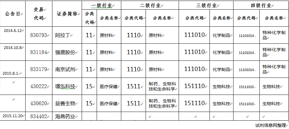 截止至2015年10月底,新三板挂牌的涉及生物科技、特种化学制品、化学原料药化学制剂特种化学制品多种化学制品约205家。下面仅列举与化学试剂相关挂牌企业如下: