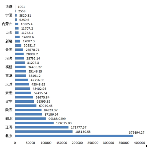 如图1所示,北京市科研机构所获项目资金近38亿元,约占项目金额总数的20.8%,超过末尾18个省市区之和。分得项目资金10亿元以上的有北京、上海、江苏和广东,总数为86亿余元,约占总额的47.25%。