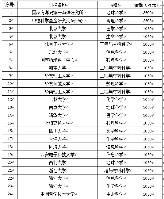 本年度自然科学基金项目单项资助最多的数额是3500万元,该项目研究方向为地球科学,被国家海洋局第一海洋研究所揽。另外,单项资助1000万元以上的项目37项,总金额42593万元,详情见表2。