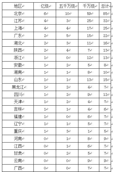 从表4中单一机构获得千万元以上资助的地区分类来看,排在前五位的仍旧是北京、江苏、上海、广东、湖北,与总体数据流一致。其中,青海和西藏没有单一机构获得千万以上资助,这和当地重点科研机构稀缺以及环境恶劣有关。