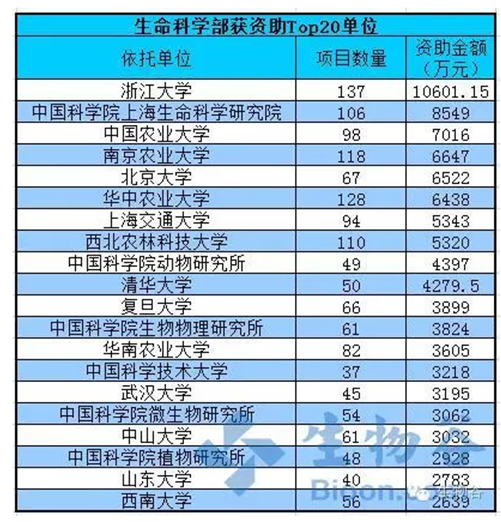 生命科学部获资助单位TOP20名单如下,浙江大学排名第一,2-5位分别为中科院上海生命科学研究院、中国农业大学、南京农业大学、北京大学,供读者参考。