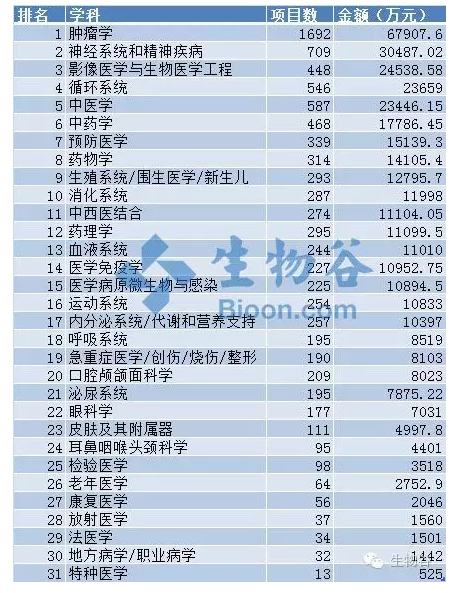 2016年医学科学部共获38亿元,较去年下降0.4亿元。一共有31个学科,8965个项目。各个细分学科排名如下: