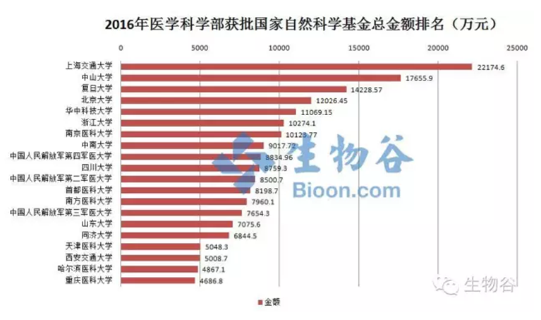 医学科学部获得资金TOP20的表单如下。从金额总数来看,上海交通大学、中山大学和复旦大学位列前三甲,三所高校均拥有出色的医学院,医学科研实力可谓全国领先。