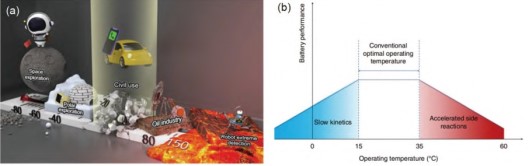 (a)锂电池面临的不同温度的应用场景示意图;(b)极端工作温度对于电池带来的影响