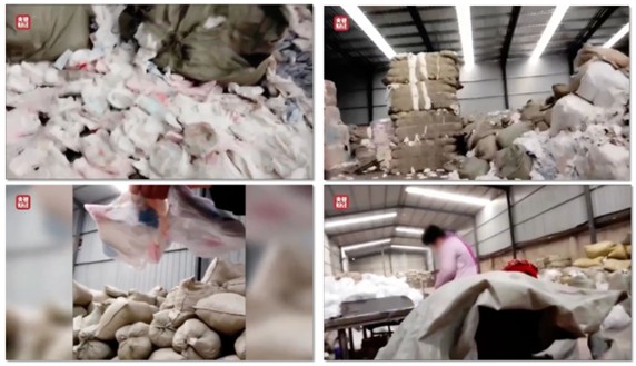 曝光问题:部分企业将母婴用品的残次品、废料(含纸尿裤、卫生巾)粉碎后,重新制成原材料(如木浆、吸水树脂),从纸尿裤和卫生巾生产厂家购买原本应销毁的残次品、下脚料等生产垃圾,这些回收料携带细菌和残留化学添加剂,从中挑出形状完整且没有明显污渍和破损的“二等品”,在桌上经过简单敲打恢复蓬松后,或使用荧光增白剂掩盖黄渍,将这些翻新品重新在市场上倒卖,每吨售价高达七八千元。而挑剩无法再利用的部分也不会浪费,被投入机器打碎分离成原材料,再次卖给一次性卫生用品生产企业。