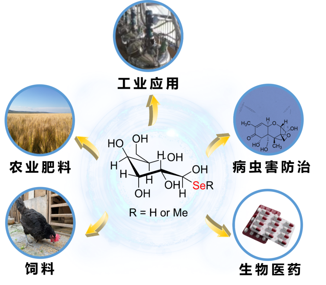 扬州大学硒科学研究团队长期以来一直从事与硒相关的研究与应用推广工作。2020年,该团队的俞磊教授提出元素转移反应理论。该理论从元素流通的视角来看待合成工业问题。在该理论指导下,他们提出实用葡萄糖为安全可靠的有机载体来负载硒,从而开发硒肥与硒饲料添加剂的新思路。目前,低价硒代葡萄糖及其衍生物已经成为一种可靠的工业硒源,其用途主要包括: