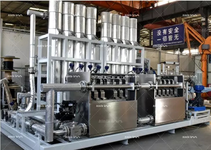 以微通道反应器为代表的微化工技术是一项新型的环保的化工技术,与传统化学工业技术相比,能够实现更环保而且占地面积非常小,同时又能合理利用资源不会造成能耗高,已引起能源化工、环境工程等自然科学界其他领域的高度重视[3,4]。微通道反应器是利用精密加工技术制造的特征尺寸在几十微米到几毫米之间的连续反应器,其内部特殊的通道结构可以大幅强化传质效果,为硝化反应的精确、稳定、安全进行提供了可行的解决方案。连续流微通道反应器可以实现根据不同工艺进行定制化,精确控制反应器内温度、系统压力、原料及硝化剂流量、冷媒流量、pH值等参数,做到反应系统温度压力的报警和联锁、自动进料控制和联锁等,还设有泄爆管和紧急排放系统。下图为山东豪迈公司为浙江某企业定制的连续流硝化反应工厂,目前已稳定生产。
