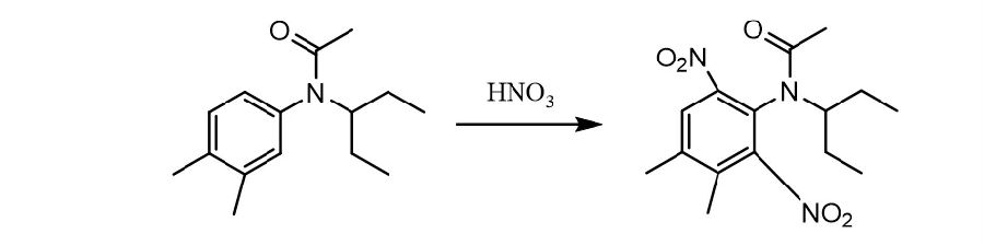 (1) N-(l-乙基丙基)-N-乙酰基-3,4-二甲基苯胺硝化反应,采用硝酸直接硝化的方法,反应方程式与反应机理如图,图2 N-(l-乙基丙基)-N-乙酰基-3,4-二甲基苯胺硝化反应方程式