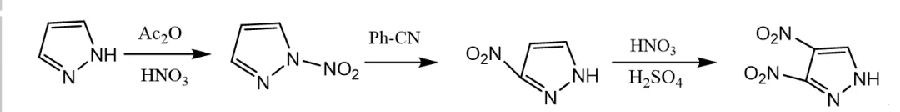 (2) 以吡唑为原料,在硝酸-乙酸酐体系下硝化合成N-硝基吡唑,再在苯甲腈中热重排制备3-硝基吡唑,之后在硝硫混酸体系下硝化合成3,4-二硝基吡唑。该路线的反应方程式如下: