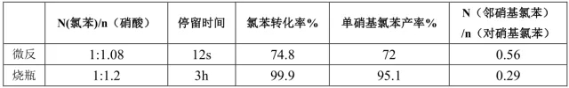 表1结果表明,在微通道反应器中,氯苯单程转化率虽相对较低,但所得到产物中邻位选择性有明显提高,且副产物相对较少。分析原因,尺寸被微型化的微通道反应器,强化了传热、传质过程,弱化了反应中邻位空间位阻效应,利于生成邻硝基氯苯,提高了氯苯邻位选择性。