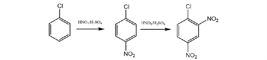 由氯苯经两步硝化而得,先用氯苯萃取一硝化废酸,将萃取氯苯与二硝化废酸混合,在滴加一硝化混酸在70 ℃行一硝化,分离出一硝基物再用二硝化混酸在50~100 ℃进行二硝化,即得到二硝基物,然后用冷却结晶法精制即得商品2,4-二硝基氯苯。大规模生产时,更适合采用微通道反应器连续硝化法。