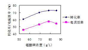 由图可见,随着锰酸钾浓度的增加,转化率和电流效率均先增大后减小,锰酸钾浓度以75~85 g/L为宜。通常电解温度低,电解液浓度也低,以免高锰酸盐结晶析出。
