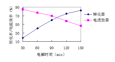 随着电解时间的延长,转化率逐渐增大,电流效率逐渐减小。电解过程,电解时间延长,转化率得到了提高,但电能消耗大幅增加,因此在提高转化率的同时要考虑电能消耗,电解时间以120 min为宜。