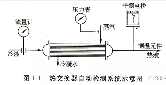 图1—1的热交换器是利用蒸汽来加热冷液的,冷液经加热后的温度是否达到要求,可用测温元件配上平衡电桥来进行测量、指示和记录;冷液的流量可以用孔板流量计进行检测;蒸汽压力可用压力表来指示,这些就是自动检测系统。