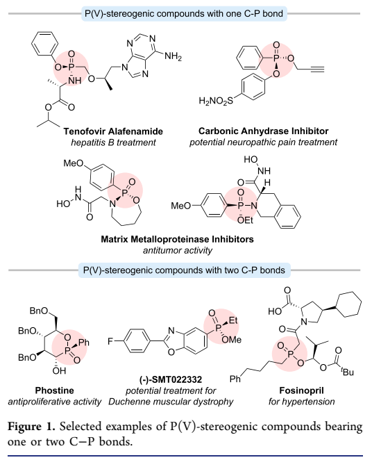 P-手性有机膦氧化合物,含有一个或两个C-P键,是一类具有重要价值的结构,在药物化学和有机合成中具有广泛应用。这些手性P(V)化合物广泛存在于许多天然产物、药物和生物活性分子中。在含有一个C-P键的化合物中,替诺福韦艾拉酚胺是治疗慢性乙型肝炎的一线药物;含有两个C-P键的化合物也可由其单C-P键对应物衍生而来,展现出多样化的生物活性。例如,Phostine表现出有效的抗增殖特性(图1)。