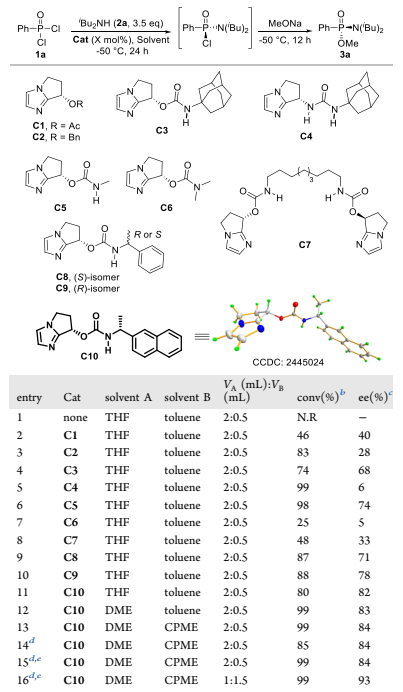 作者首先以市售的苯基膦酰二氯为模板底物,二异丁胺作亲核试剂与缚酸剂,并以四氢呋喃和甲苯分别作反应溶剂与底物溶剂,在-50 °C的低温条件下对催化剂进行了筛选和优化。实验结果表明,不添加催化剂时,反应无法进行。C1和C2催化剂在不对称C-酰化反应中展露出较好的效果,但在此条件下,该催化剂的立体控制效果有限(entry 2-3)。基于C3在瑞德西韦的不对称合成中的优异表现,研究团队尝试其催化该反应,获得74%转化率和68% ee(entry 4)。进一步结构修饰发现:将C3的氨基甲酸酯结构片段换为脲基(C4)可提高反应活性但损害对映选择性(entry 5);N–H键对高催化性能至关重要(C5/C6,entry 6-7)。随后筛选多种NH-取代催化剂,确定了最优催化剂C10表现出最高立体选择性(82% ee,entry 11)。随后进行溶剂以及反应时间等条件的优化,最终确定以1 mL DME为反应溶剂,1.5 mL CPME溶解底物,催化剂负载降至15 mol%,第一步反应36小时,随后使用甲醇钠淬灭可在高转化率下保持高对映选择性(entry 16)。