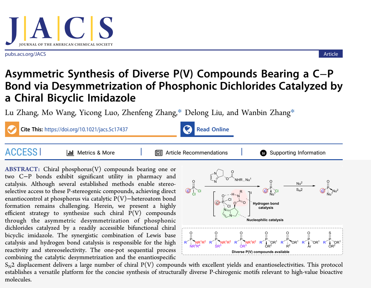 综上所述,上海交通大学张万斌团队使用课题组基于“键角调控”策略自主开发的手性双环咪唑催化剂,将前手性膦酰二氯的去对称化与立体专一的SN2亲核取代反应相结合,一锅法成功地构建了含C–P键的P(V)手性中心。该策略展现出优异的底物普适性与官能团兼容性,能以高产率和高对映选择性合成至少55种结构多样的手性膦氧化合物。机理研究证实,催化剂路易斯碱的亲核作用以及关键的N–H…O=P氢键作用的协同催化机制,是实现高对映选择性的核心。该方法的实用性在克级合成与药物分子(-)-SMT022332关键前体的制备中得到成功验证,为手性膦氧化合物的合成提供了一个强大平台。上述研究成果近期发表在J. Am. Chem. Soc.上,上海交通大学药学院博士生张露为论文的第一作者,化学化工学院张万斌教授和药学院张振锋研究员为论文的通讯作者。