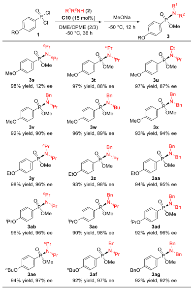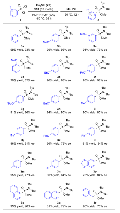 此后,作者系统考察了该催化体系对各类膦酰二氯底物的兼容性。研究发现苯环为对位带烷氧基的底物普遍能以高收率和高对映选择性获得目标产物(3b, 3e-3h);间位甲氧基取代底物延长反应时间至48小时后,产率为94%但选择性降低至73%(3c);而邻位取代底物则因空间位阻大、溶解性差,导致反应性明显下降(3d)。然而,当引入吸电子基团,反应的对映选择性会出现显著降低,延长第一步的反应时间至48小时,可以提高反应产率。该反应对二取代苯环底物(3o-3q)同样适用,并能兼容烷基膦酰二氯,例如苄基底物能以90%的产率和75%的ee值得到产物(3r)。这些结果一致表明,芳环上对位给电子取代基有助于提升磷中心的电子云密度,从而稳定催化中间体,实现更好的催化效果。作者还分离纯化了产物(3b)的前体化合物氯代膦酰胺,该化合物的对映选择性为96%。