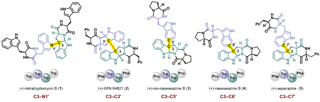 二聚二酮哌嗪吲哚生物碱,是一类常见的吲哚类天然产物。不仅能通过在二酮哌嗪骨架上组装不同氨基酸扩展分子三维结构多样性,还可凭借多环骨架赋予该类化合物广谱且强效的生物活性,其中包括抗菌、抗病毒、抗肿瘤等。因此,备受药物化学家关注。