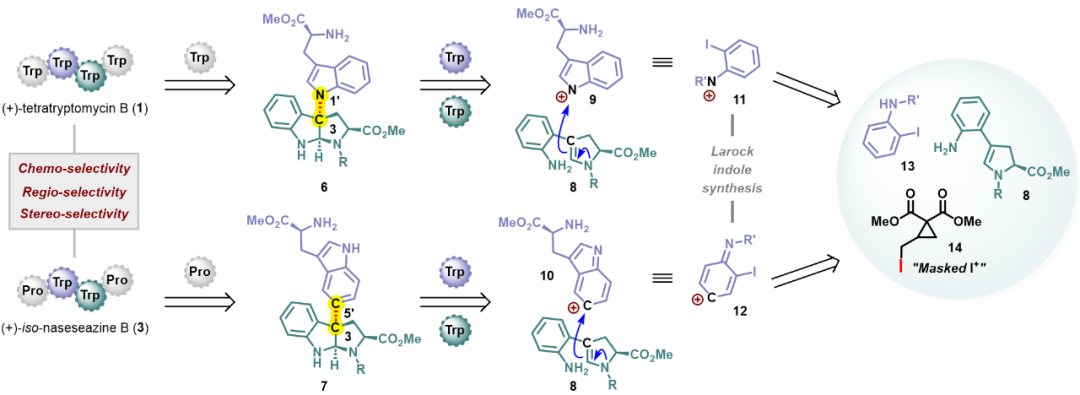 最近,华东师范大学姜雪峰/白磊阳团队,应用组内开发的“隐藏式”碘介导氧化偶联反应选择性构建C3−N1'/C5'键,实现3个C3连接二酮哌嗪生物碱发散性全合成和大量类似骨架化合物库构建,包括(+)-tetratryptomycin B、(+)-pestalazine B和(+)-iso-naseseazine B。此偶联反应,通过调控苯胺衍生物的电子和空间位阻效应,来控制反应的化学选择性和区域选择性,并通过预先形成的烯胺-苯胺偶联物立体化学特征,来控制反应的endo选择性。相关研究成果于近期在线发表在《德国应用化学》杂志上。
