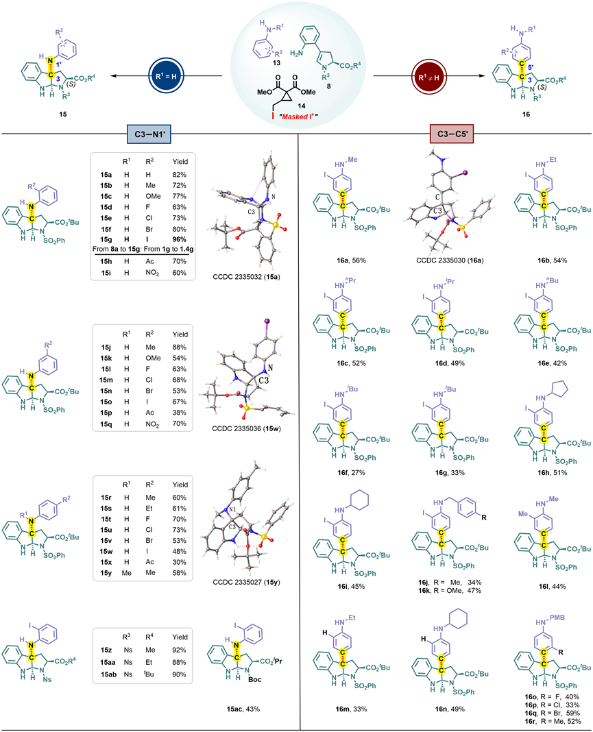 图1 C3-N1'与C3-C5' “分叉式”立体选择性调控链接