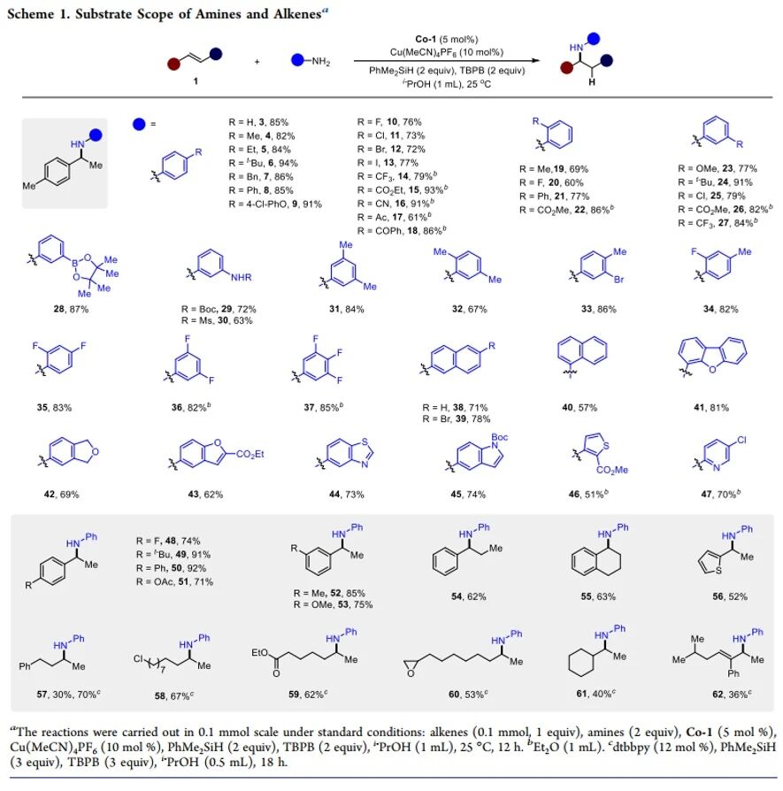 南京大学谢劲/骆培成/李伟鹏团队开发了一种钴/铜双金属协同催化策略,通过协同氧化或光氧化还原过程,成功实现了烯烃的多样性自由基氢官能团化反应。该体系兼容多种亲核试剂,包括胺类、醇类、磷酸酯、末端炔烃、TMSN3、TMSCN和NH4SCN。其反应条件温和、底物适用范围广、官能团兼容性好,并成功拓展至高对映选择性的不对称合成,为快速构建复杂功能分子,尤其是有药物相关性的手性胺类化合物,提供了强有力的新策略。通过自由基捕获实验、EPR、Stern-Volmer淬灭实验和DFT理论计算等机理研究,证实反应经历了钴/铜双金属自由基接力催化循环。该研究不仅彰显了双金属协同催化在应对复杂合成挑战中的巨大潜力,也为发展新型多金属催化体系提供了重要借鉴。