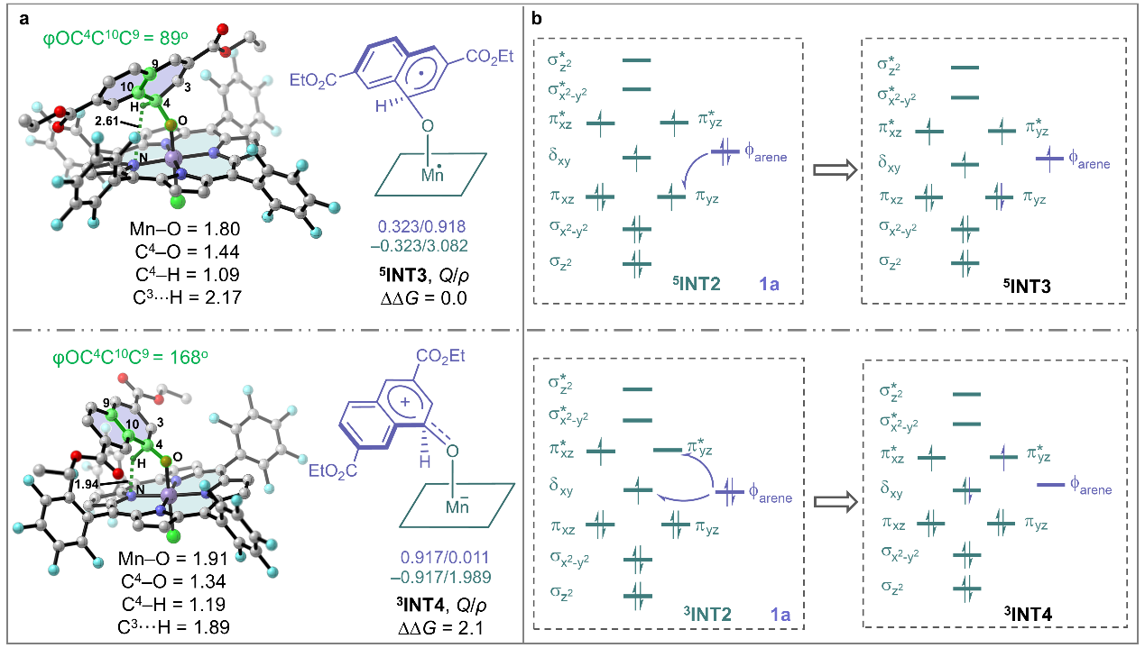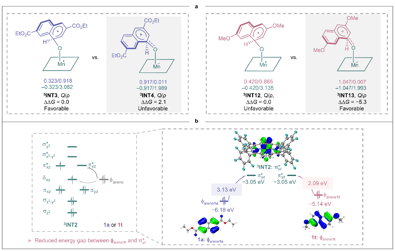 基于上述问题,浙江工业大学佘远斌教授/李贵杰研究员/杨云芳教授研究团队另辟蹊径,采用温和的仿生锰卟啉催化剂,通过在萘环上特定位置引入吸电子取代基,成功实现了反应路径的切换,将主导反应从羟基化转向环氧化,并首次分离表征了多种缺电子萘环氧化物。通过实验研究与理论计算相结合,从分子层面深入揭示了可能的氧化机制:环氧化倾向于通过自由基路径进行,羟基化则主要遵循两性离子路径。取代基的电子效应是调控这两条路径竞争、实现选择性反转的关键。本研究在合成方法学与反应机理层面取得了重要进展,显著推动了金属卟啉催化领域的发展。团队所发展的高效、选择性环氧化方法,在精细化学品合成、药物活性分子制备及代谢物研究等方面具有广阔的应用前景。