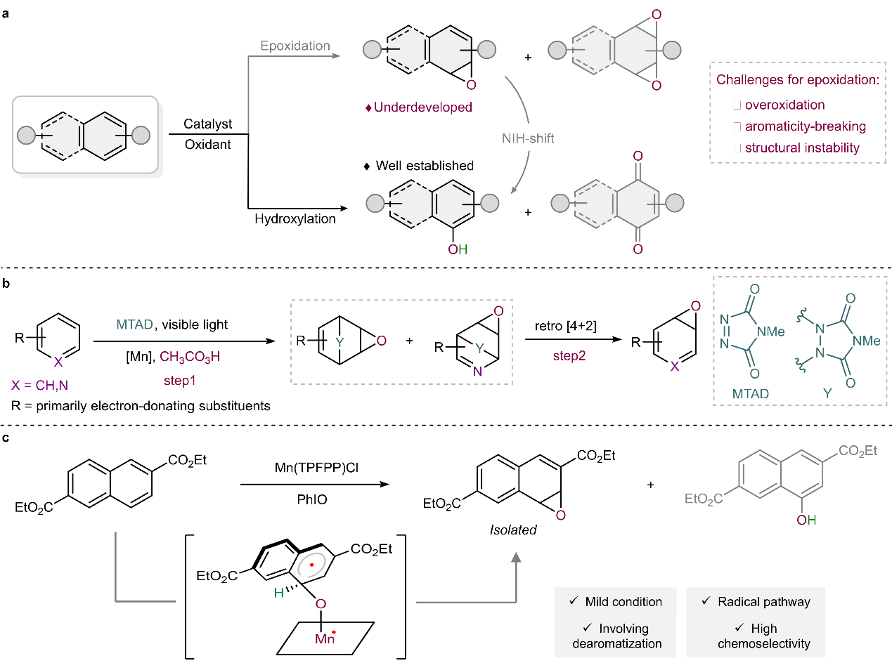 芳烃化合物的高稳定性使其在氧化过程中易于发生过氧化反应,因此其选择性催化环氧化一直是有机合成中的一个长期挑战。环氧化物作为反应中的高活性关键中间体,通常寿命较短,易通过“NIH迁移重排”转化为更稳定的羟基化产物,这导致目标环氧化物的捕获与分离极为困难。