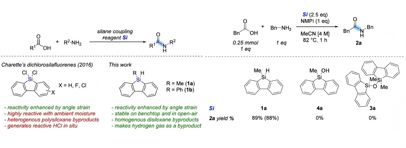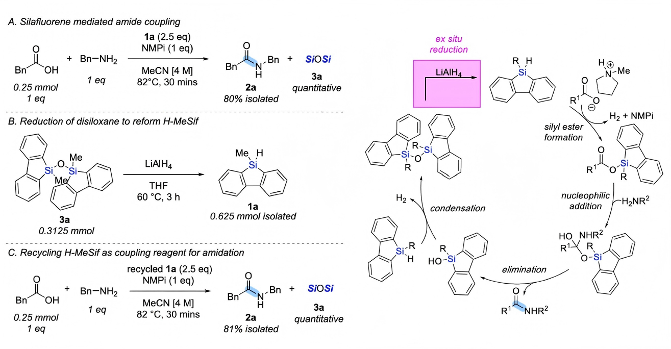 近日,加拿大多伦多都会大学M. J. Adler课题组发现9-甲基-9H-9-硅芴和9-苯基-9H-9-硅芴两种有机硅化合物可作为高效偶联试剂,用于羧酸与胺的直接酰胺化反应。该方法在开放空气条件下即可高效进行,无需严格除水,仅产生氢气和二硅氧烷两种副产物。这是首次报道的可回收分子型有机硅偶联试剂,为发展绿色、可持续的酰胺合成方法提供了重要突破。