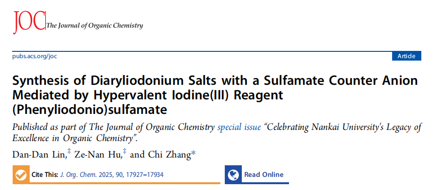 近日,南开大学张弛课题组开发了一种以苯磺胺碘盐(PISA)为试剂、六氟异丙醇为溶剂,在室温下高效合成对称与非对称二芳基碘鎓盐的新方法。该方法具有高原子经济性、优异的官能团兼容性与良好的可放大性,成功应用于克级规模合成,并可通过简单阴离子交换直接获得商用光酸发生器。此外,所得含磺胺酸反离子的二芳基碘鎓盐还可作为芳基化试剂,与酚、胺及氯离子等亲核试剂直接反应,为相关功能分子的构建提供了简便途径。
