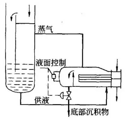 垂直壳侧热虹吸再沸器沸腾过程发生在壳侧。壳侧装有折流板,以使流体纵向流动。垂直壳侧再沸器适用于特殊的场合,在这种场合下,将加热介质放在壳侧是不合适的。例如,对于废热锅炉,由于加热流体的腐蚀性,因而要用特殊的金属材料,这时加热介质走管程较为合适。