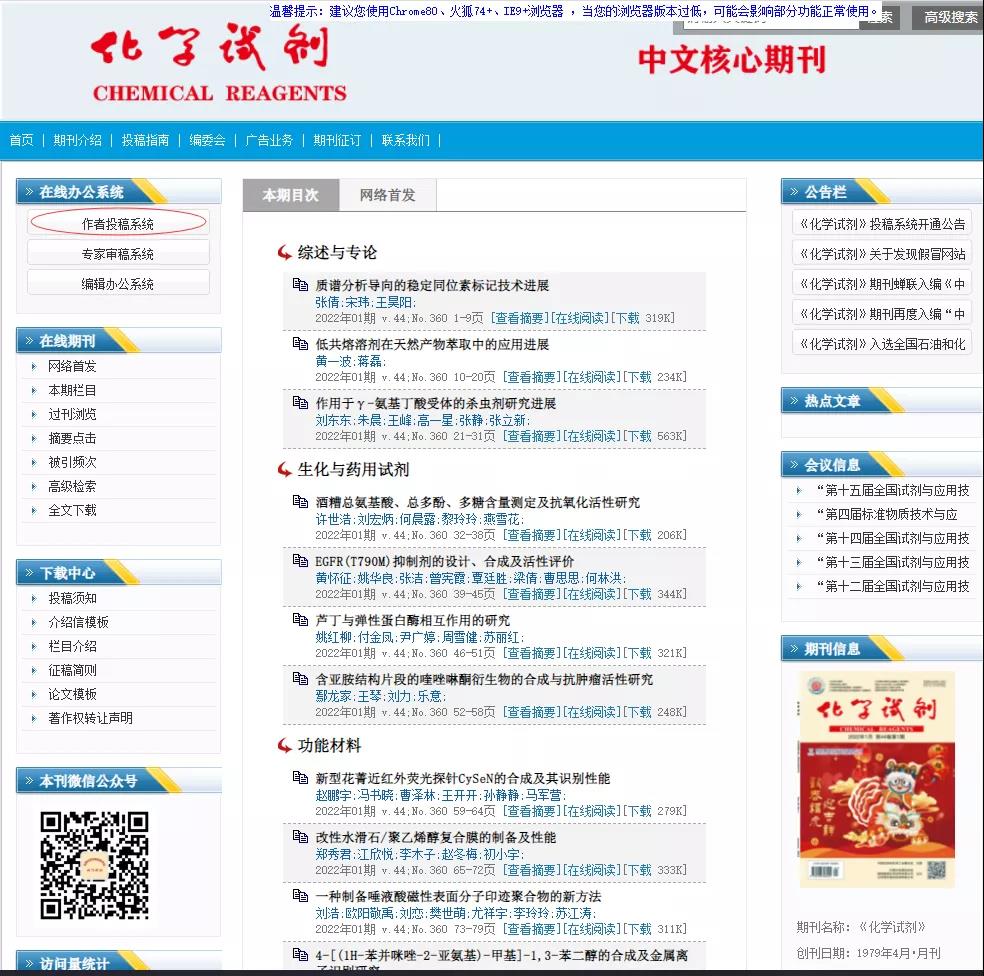 《化学试剂》期刊自2022年1月28日起开通全新的投稿系统,作者投稿及查询登录网址为:https://hxsj.cbpt.cnki.net。作者可在线注册投稿,并可查看审稿进度和结果。2022年1月28日前已投稿作者仍可登录旧系统(目前通道:http://c.chinareagent.com.cn)进行操作。即日起,旧投稿系统将不再接收新稿件,请在新系统注册投稿!新的投稿系统为试用阶段,各位作者及专家在使用过程中遇到任何问题,均可致电010-58321793或发E-mail:webmaster@chinareagent.com.cn与编辑部联系。