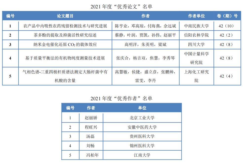 《化学试剂》1979年创刊,是编辑出版化学试剂及相关领域的中文核心期刊。近年来,在编委专家的大力支持下,本刊组约稿数量不断增加,论文质量、期刊评价指标稳步提升。为激励广大作者撰写学术论文的积极性,吸引更多高水准的论文,进一步提高我刊的学术水平和稿件质量,《化学试剂》编辑部连续多年开展了“优秀作者”和“优秀论文”的评选活动,并向获奖者颁奖及赠刊。