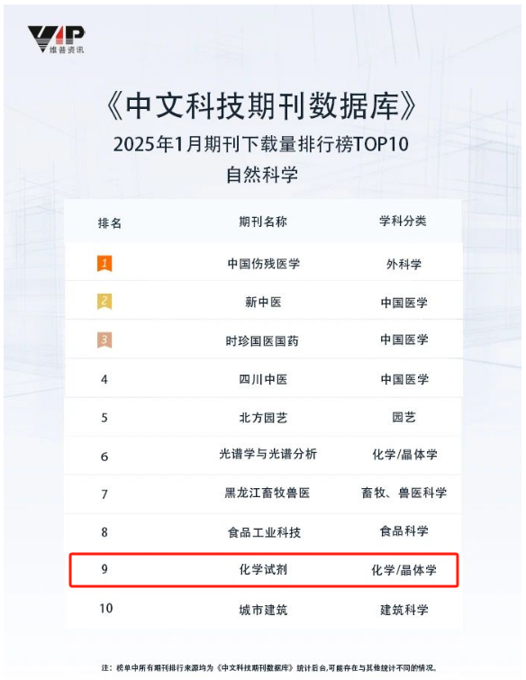 2025年2月5日,《中文科技期刊数据库》自然科学期刊月度下载排行榜公布,此表单基于维普数据库中的15000余本期刊的全平台数据进行统计,学科分类参考《中国图书馆分类法》,其中《化学试剂》入选1月下载榜单,位列“化学、晶体学”类第二名。