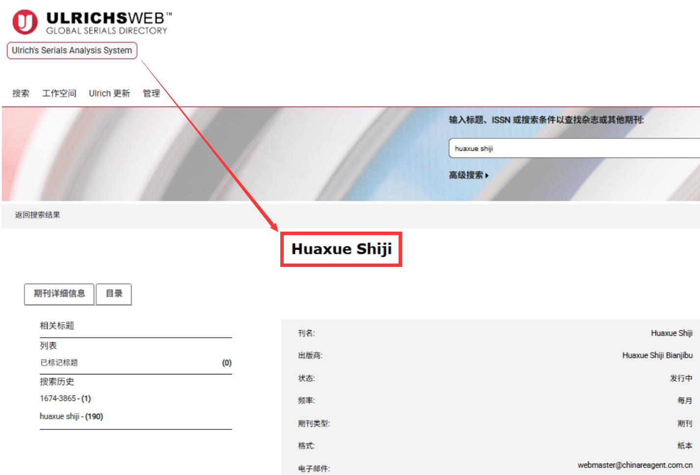 近日,《化学试剂》被美国乌利希国际期刊指南收录,标志着期刊的学术质量、国际化指标等方面得到了充分认可和肯定,是期刊学术水平和国际影响力与核心竞争力的重要体现。