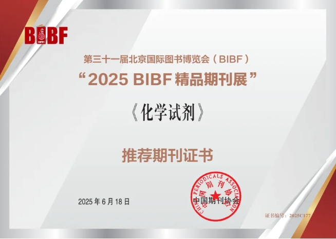 近日,由国家新闻出版署主办、中国图书进出口(集团)有限公司承办的第三十一届北京国际图书博览会(BIBF)在北京国家会议中心举办。经中国期刊协会评审,《化学试剂》获评“2025 BIBF精品期刊展”推荐期刊。