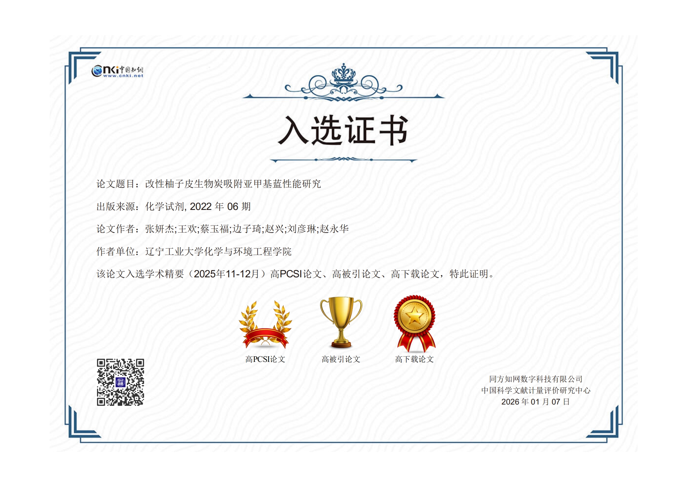 近日,中国知网《学术精要数据库》发布了2015—2025年高影响力论文,《化学试剂》共有211篇论文被收录,其中排名学科前1%的高被引论文14篇、高下载论文33篇、高PCSI(论文引证标准化指数)论文15篇,“三高”(高被引、高下载、高PCSI)论文3篇。上述高影响力论文可通过《学术精要数据库》(如需下载获奖证书可点击:https://xsjy.cnki.net/)的首页文献评价模块进行筛选查看。
