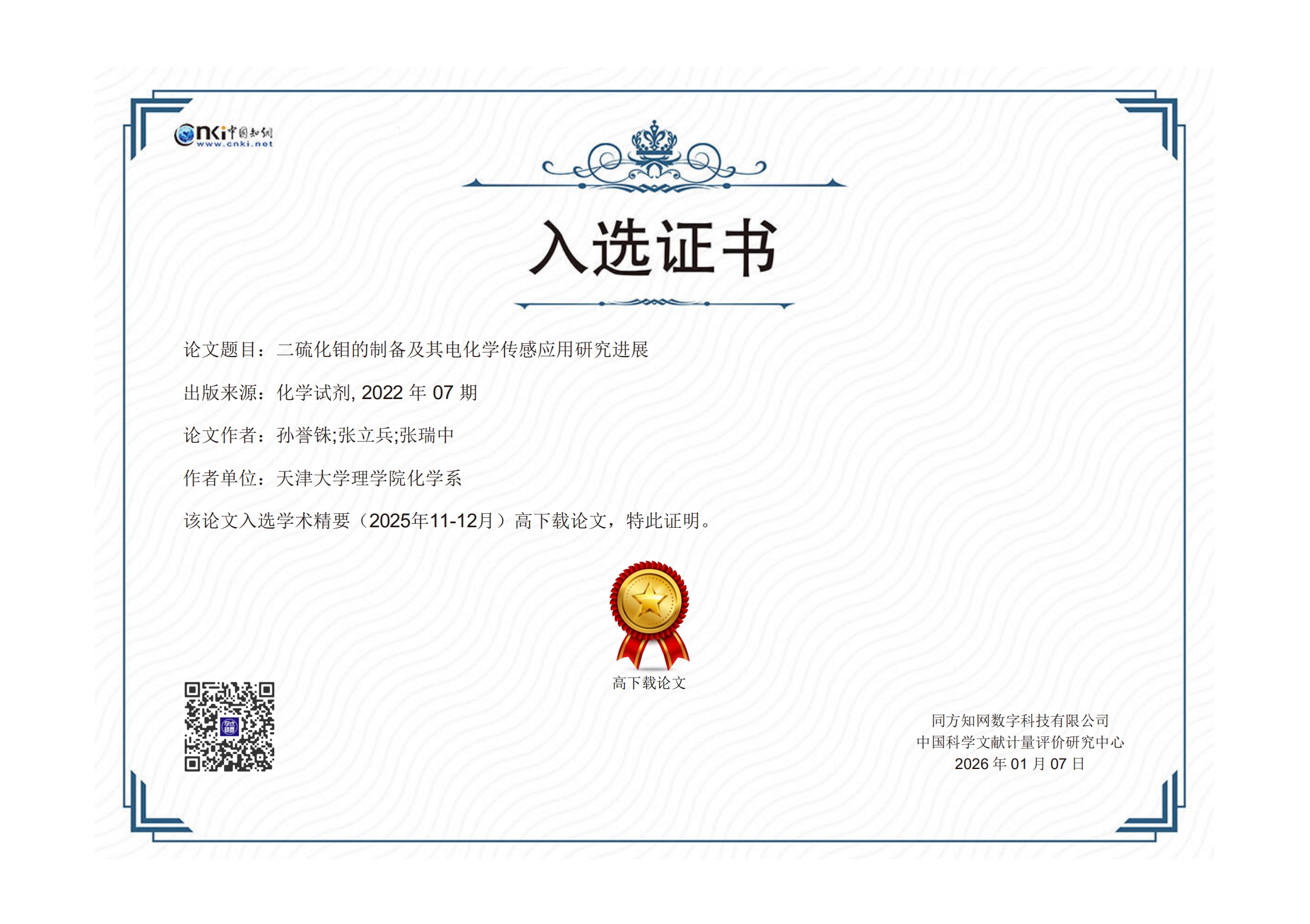 [14]孙誉铢,张立兵,张瑞中.二硫化钼的制备及其电化学传感应用研究进展[J].化学试剂,2022,44(7):1063-1070.