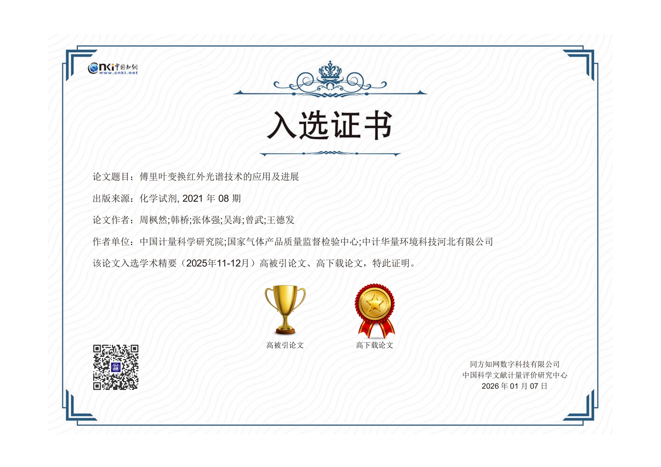 入选证书示例