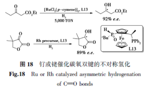 JoSPOphos除了可以实现碳碳双键的不对称氢化外,还可用官能团化羰基的不对称氢化[33]。如配体L13在钌催化的3-氧代戊酸乙酯的不对称氢化中表现出优异的催化活性(TON高达5 000),氢化产物β-羟基酯的e.e.值最高为92%。此外,配体L13也可应用于铑催化的环状α-酮酸酯的不对称氢化,得到应用广泛的泛酰内酯,e.e.值为89%(图18)。
