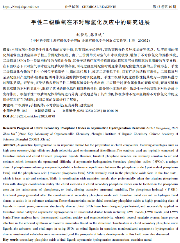 不对称氢化是高效高选择性制备手性化合物的重要手段,其催化剂的手性控制通常依赖于对空气和水极度敏感的手性三价膦配体,这增加了不对称氢化的操作难度。二级膦氧是一类结构独特的含磷化合物,自由状态下以对空气和水稳定的五价磷形态存在,并且可在多个位点引入手性和不同取代基,具有广泛的结构可调性。其与过渡金属配位时则通常使用配位能力更强的三价磷形态,且配位后产生的磷-羟基官能团可作为氢键供体协助活化底物,是一类在催化氢化中极具潜力的配体。