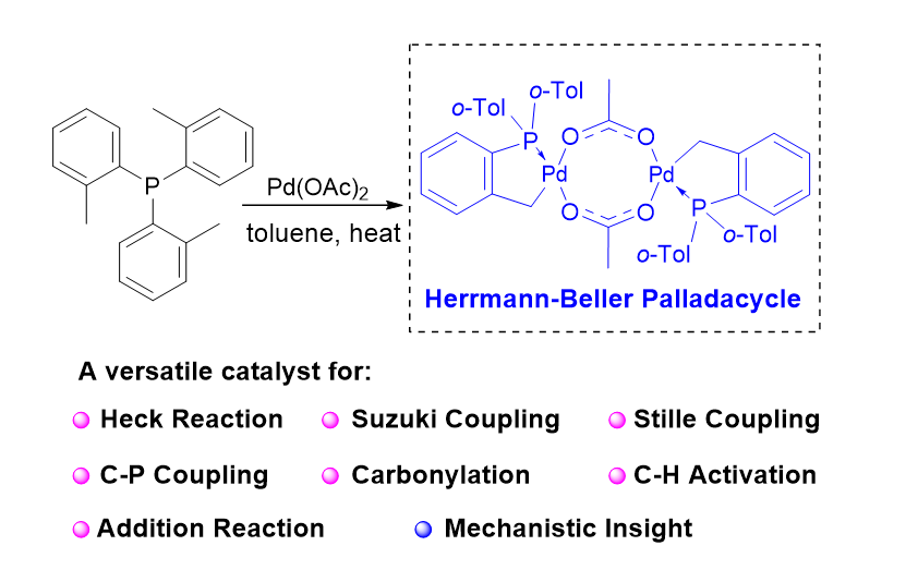 环钯(palladacycle)催化剂凭借Pd–C共价键的独特结构,在有机合成中展现出优异的热稳定性和高催化活性。Hermann–Beller型环钯作为该类催化剂的重要代表,自1995年被报道以来以其空气稳定、易制备及在Heck、Suzuki–Miyaura、Buchwald–Hartwig、C–P偶联与羰基化等反应中的广泛适用性受到广泛关注。该前催化剂可在高温或碱的作用下缓慢释放活性零价Pd,表现出极高的TON并能活化传统难反应底物(如氯代芳烃);同时亦被用于聚合与天然产物关键步的构建。近年来的动力学、原位表征与DFT研究揭示了体系中Pd(0)/Pd(II)与Pd(II)/Pd(IV)循环可能并存、以及向钯纳米团簇转化与“水效应”对催化行为的影响,为理解机理与设计改良型催化剂提供了重要方向。