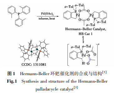 1995年,Herrmann等[5]发现三(2-甲基苯基)膦和醋酸钯在甲苯中加热可以得到一个空气稳定的黄色固体,经过单晶结构分析发现其结构为醋酸根桥联的二聚体环钯催化剂1,该催化剂被称为Hermann-Beller环钯催化剂(图1),其典型特征是含有sp3杂化的碳钯键。Beller等[6]通过单晶结构分析对该催化剂的结构进行了表征,并考察了其在Heck反应和Suzuki反应中的应用。