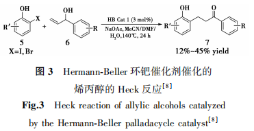 Mioskowski等[8]发现在卤代芳烃5与芳基烯丙醇6的Heck反应中,当化合物5的邻位和对位存在2个以上的羟基时,使用传统的Pd(OAc)2/Et3N或Pd(OAc)2/Cs2CO3催化体系导致碘被还原,且未观察到偶联产物。而使用Hermann-Beller环钯催化剂HB Cat 1与NaOAc的混合溶剂体系,可以得到双键迁移的羰基化产物7,收率介于12%~45% (图3)。
