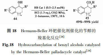 Zhang等[28]开发了一种新型苄醇类化合物44羧化方法。以1-苯基-乙醇为模板底物,经过一系列条件筛选,发现2.5 mol%环钯催化物、1.3 mmolHCl、2 MPa CO和2-丁酮作溶剂的条件下,苄醇羟基羧基化产率90%;当催化剂降至1 mol%时,产率仍有87%。该方法能够高效构建多种羧化产物45,且对多种官能团底物具有良好兼容性(产率49%~99%)。此外,在羟基羧基化1-(4-异丁基苯基)乙醇转化为布洛芬的克级实验中,产率80%,所用环钯催化剂载量仅为0.5 mol%(图18)。