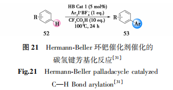 Storr等[31]使用Herrmann-Beller环钯催化剂,实现简单芳烃52与二芳基碘鎓盐进行芳基化反应的新方法。对比10 mol%的醋酸钯为催化剂的反应条件下,偶联产率最高为86%但副产物比例达到16%;而环钯化合物1在该反应中表现出更好的催化效果,在5 mol%催化剂用量下,几乎可以专一性地生成目标产物,仅检测到微量副产物联苯,这一结果显著优于其他催化体系。使用环钯催化剂进行底物拓展,当二芳基碘鎓盐含有供电子基和吸电子基时均能顺利进行,产率介于19%~99%之间,其中对位带有吸电子基团(Ar = p-ClC6H4)表现出更佳的反应性能(99%)。此外,使用Ph2I+OTf-为芳基化试剂,还考察了芳烃底物的反应适用范围。甲苯、二甲苯、均三/均四甲苯及多甲基取代苯系底物(R = tol, o-xyl, m-xyl, p-xyl等)较容易发生芳基化反应(67%~96%);而当底物上的取代基位阻增大时(R = -iPr, -tBu, -OMe, -OPh等),产率降低至43%~63% (图21)。